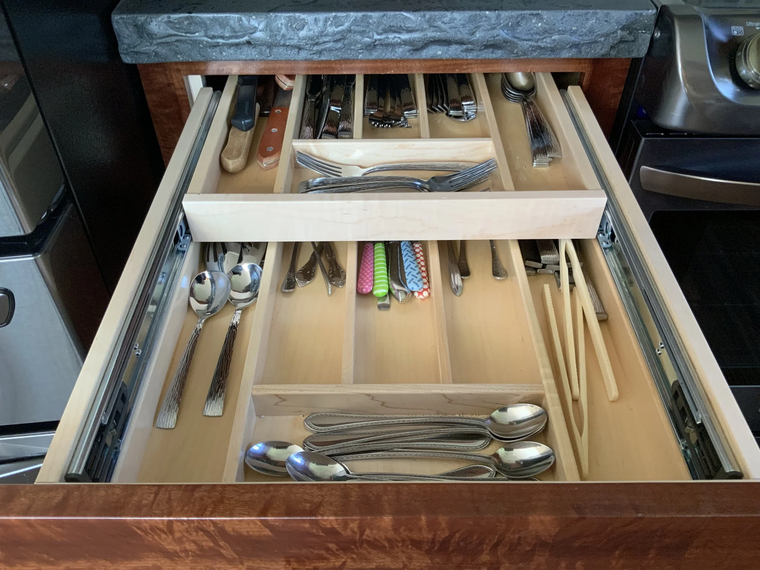This kitchen was designed and built by the crew of MIB. It makes perfect sense that the Owner is able to showcase his many talents in his own home. The cabinets are made of Figured Makore wood. The Live Edge countertops were installed by Hilltown Concrete. The beautiful backsplash was installed by AD Tile. Palmeri Electric did the lighting, including the Under cabinet lighting. And MIB also installed the floors. Be sure to check out the entire gallery that includes BEFORE pictures!